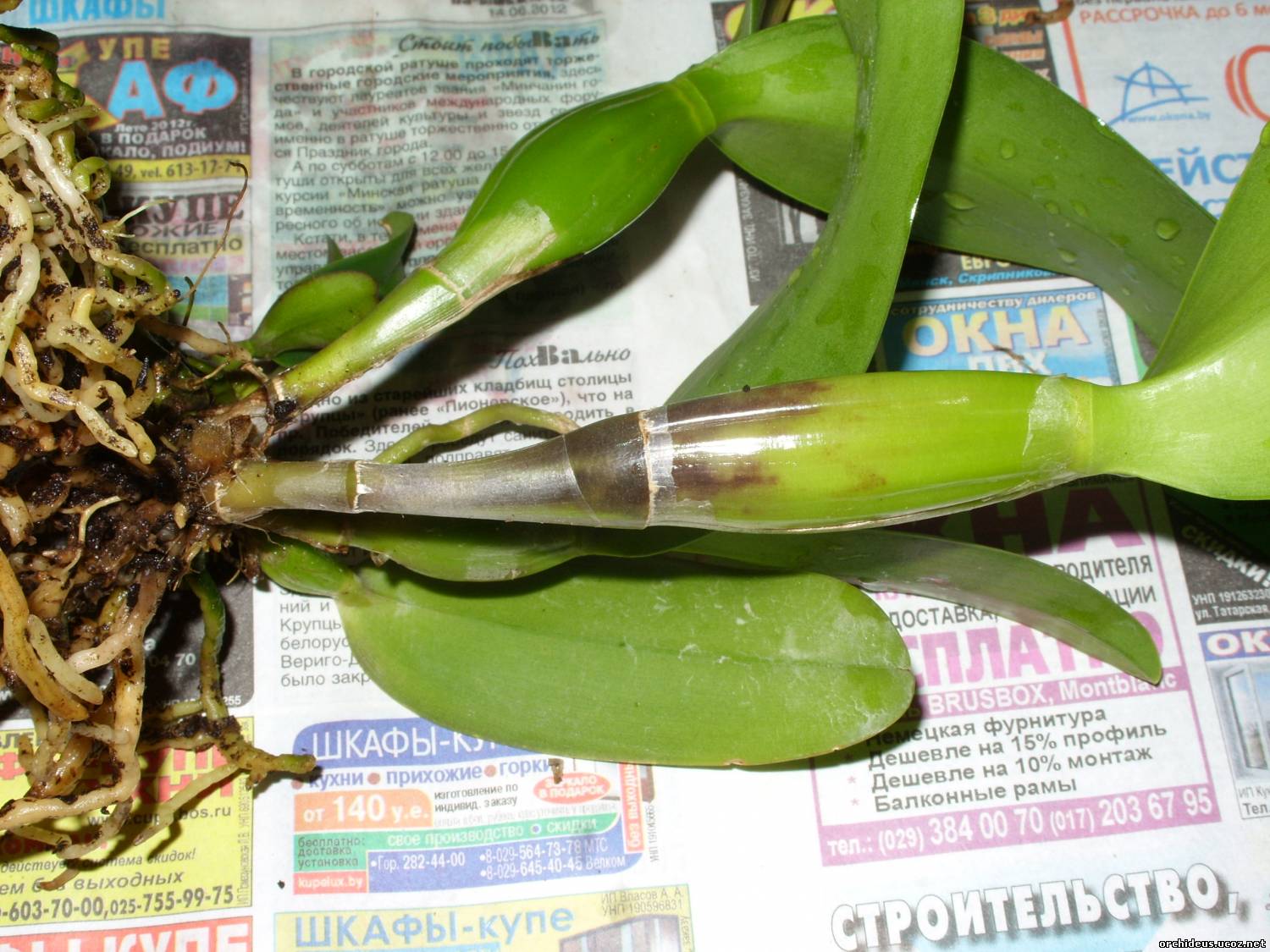 | Ksenia, огромное спасибо за ответ, а то я уже решила, что буду поить орху утром и вечером! На предыдущей фотографии корешок уже "напоенный". А так, он другого цвета - светлого. Как хорошо, что все-таки спросила... Корешок круглый и твердый, а это, кажется, главный показатель в определении жив он или мертв. На засохший не похож, и на гнилой тоже. Не хотела, помещать фото останка, но сейчас покажу, что иного выхода не было. На стволике, если не ошибаюсь, уже пошли какие-то необратимые процессы, в месте размягчения он почернел, пришлось ампутировать. Отрезала до здоровой, т.е. твердой ткани.