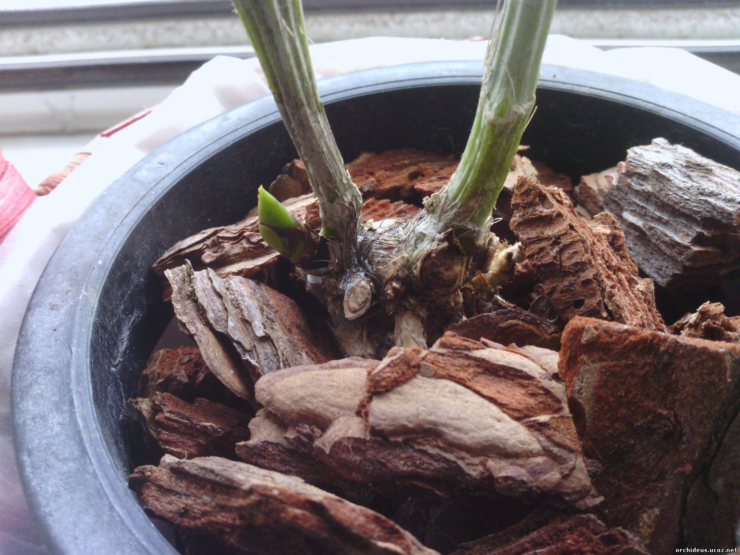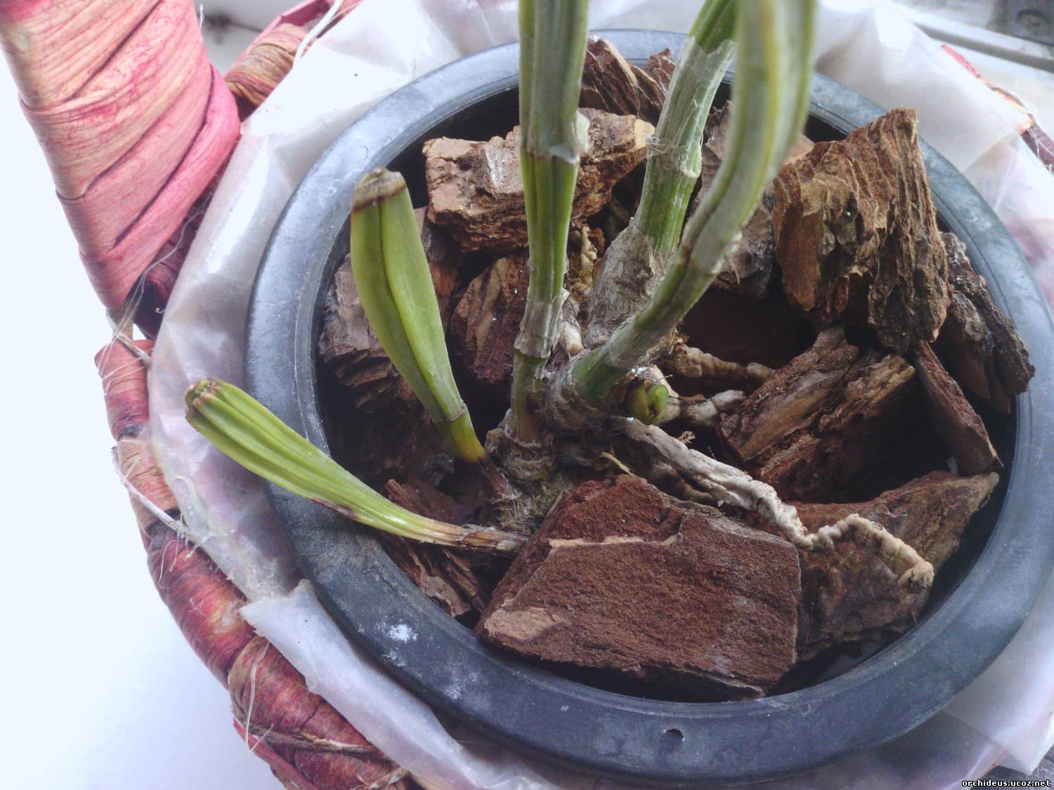 | Свежее фото каттлеи, которая передумала помирать. Корней уже 6 штук, но пока крошечные. И другой ракурс, так виднее Слегка подзагорели на солнце, снова пустились в рост, но не особо торопясь. Как корни подрастут, начну поливать.