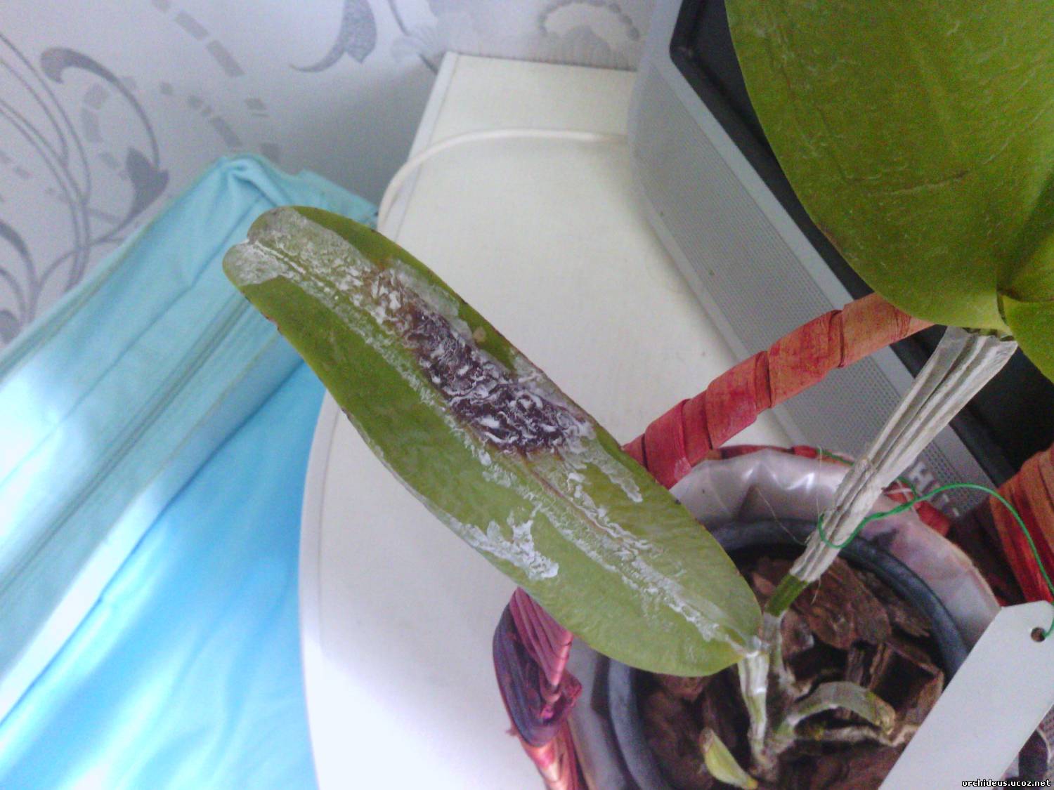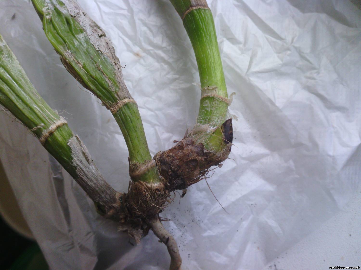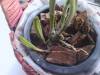 | Вот фото второй. На ней пятно появилось позже, стоят эти растения в разных местах, но симптомы одинаковые. Задние бульбы снизу как бы деревенеют, засыхают. Пятнона ней одно есть, пока не вырезала. Я ее по приезде пересадила, корней почти нет, один или два заморыша, но вчера смотрела - они начали у меня расти. Рост молодой тоже начинает чернеть. Помогите, пожалуйста, советом. Отрезать мне, видимо, эти бульбы надо, что неважно выглядят?